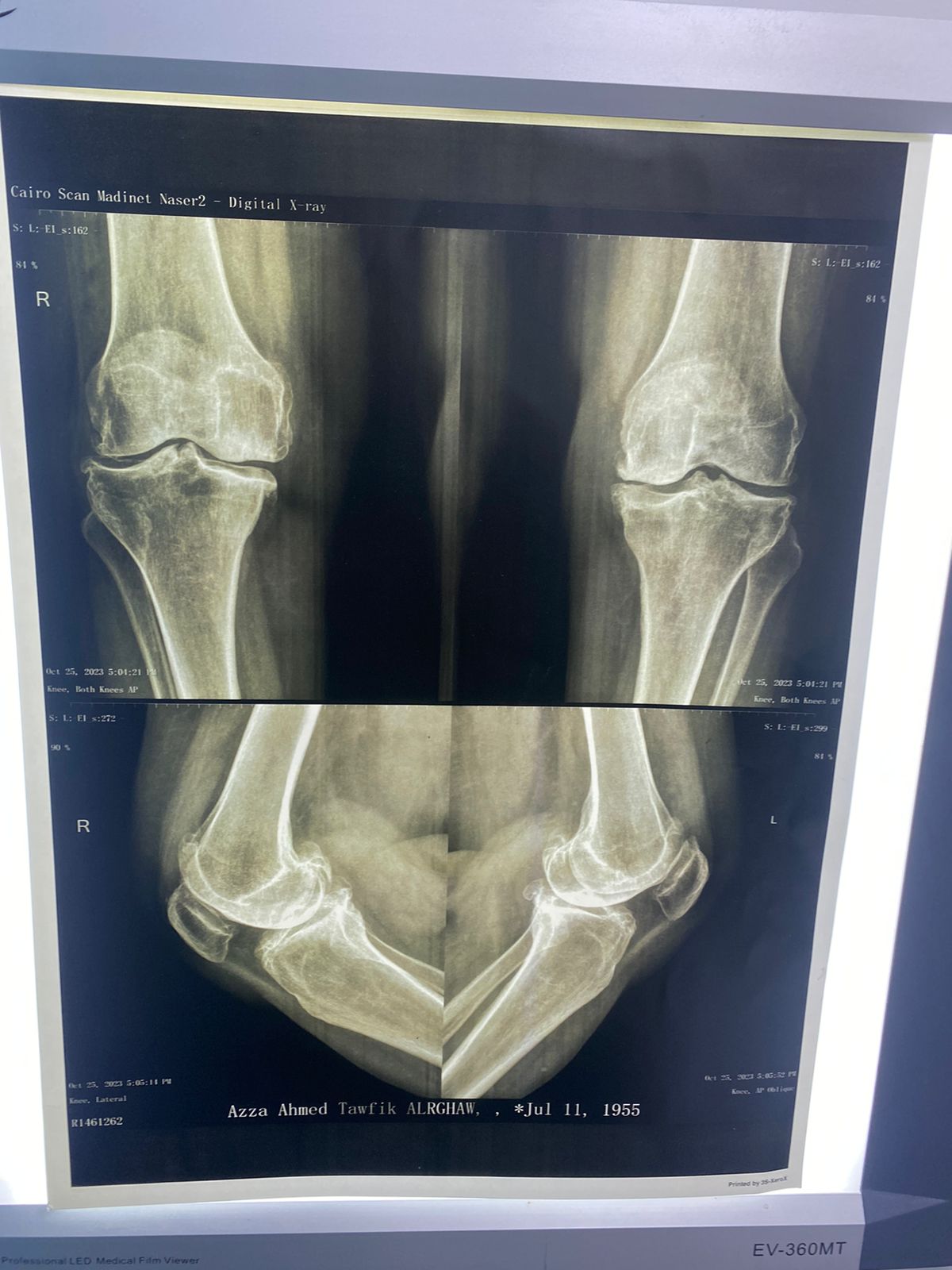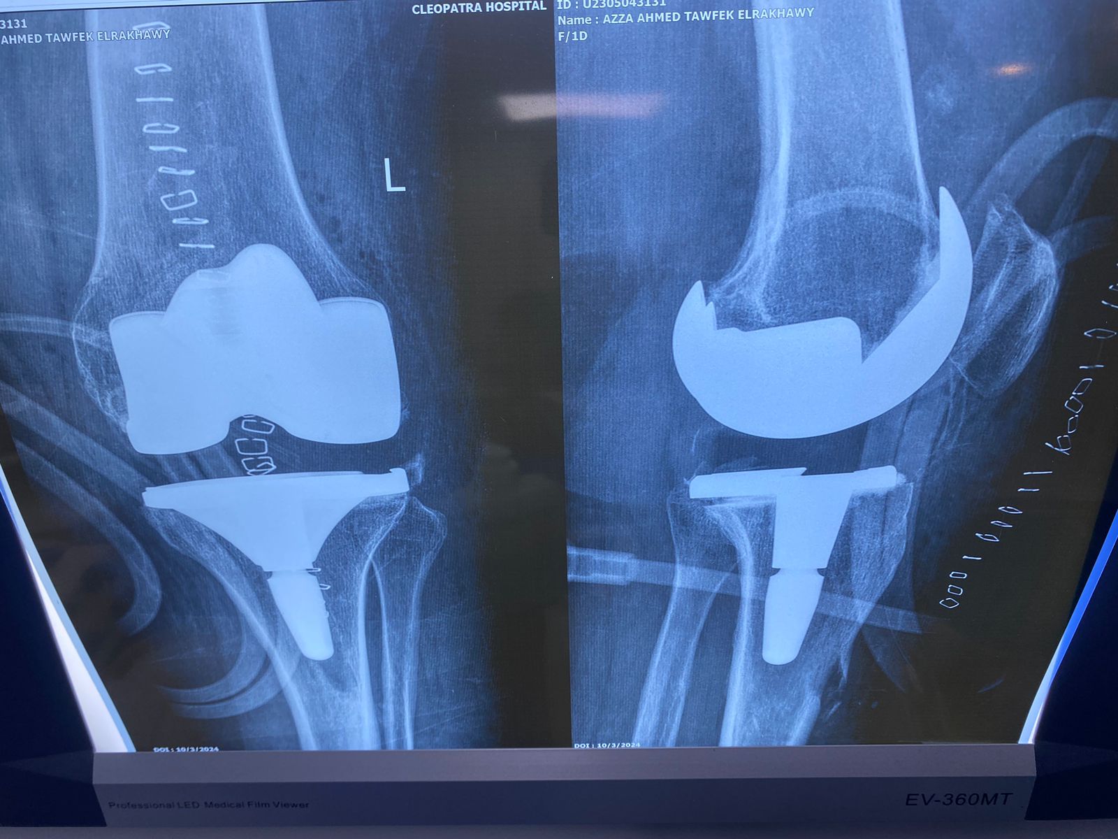السيده/ عزه الرخاوي العمر ٦٨ عام كانت تعاني من تآكل شديد بالركبتين تم تغيير المفصل الايسر منذ ٣ أعوام تم تغيير المفصل الايمن منذ ٨ اشهر هي الآن تمشي بشكل طبيعي تماما