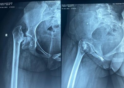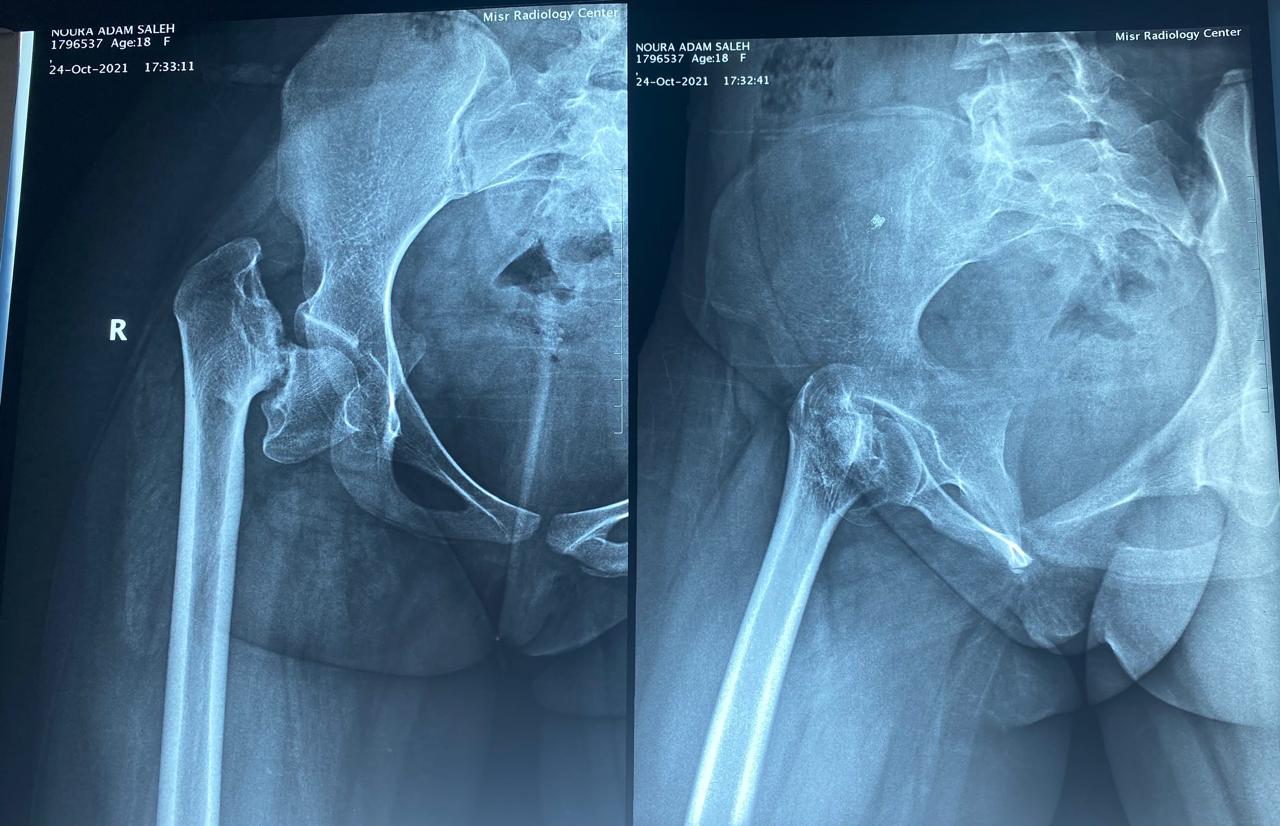 أشعة لمفصل الحوض تبين كسر قديم مهمل كما تبين وجود قصر شديد بالطرف السفلي.