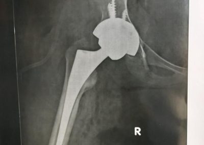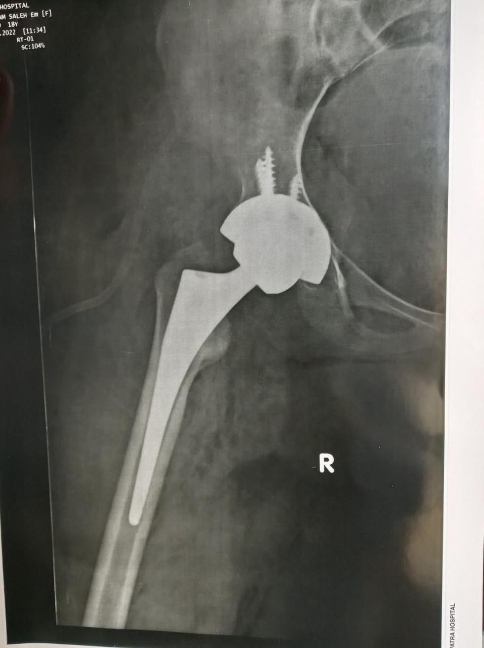 الاشعه بعد الجراحة تبين المفصل الصناعي الجديد مع تعويض تام للقصر.