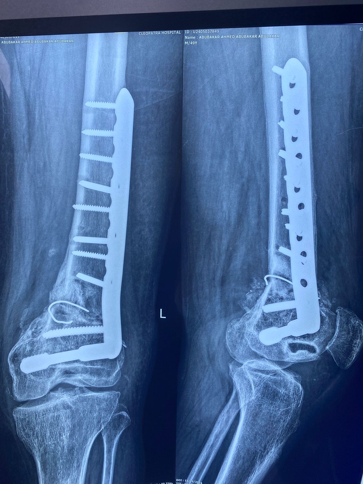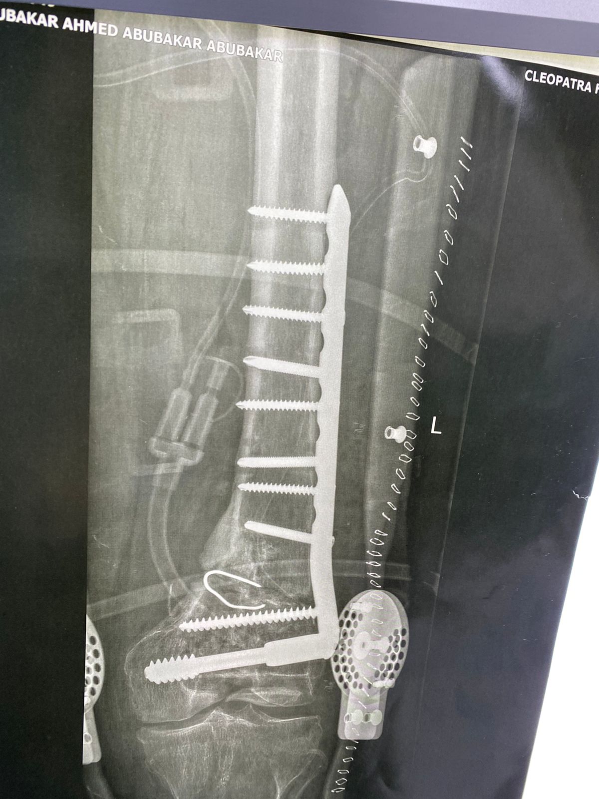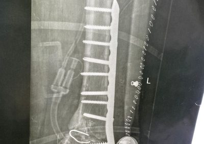 صورة اشعة تبين شريحة تم تركيبها بشكل خاطئ ترتب عليها اعوجاج بالركبة